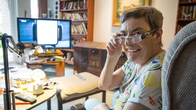 ”På hospitalet har de aldrig orienteret mig om Center for Kommunikation i Herning. Det måtte jeg selv finde ud af. Men her har jeg lånt en håndholdt lup, en skærm med lup, en lysstander med lup samt fjernsynsbriller. På DR1 og DR2 er der synstolkning, men ikke på de andre kanaler.”